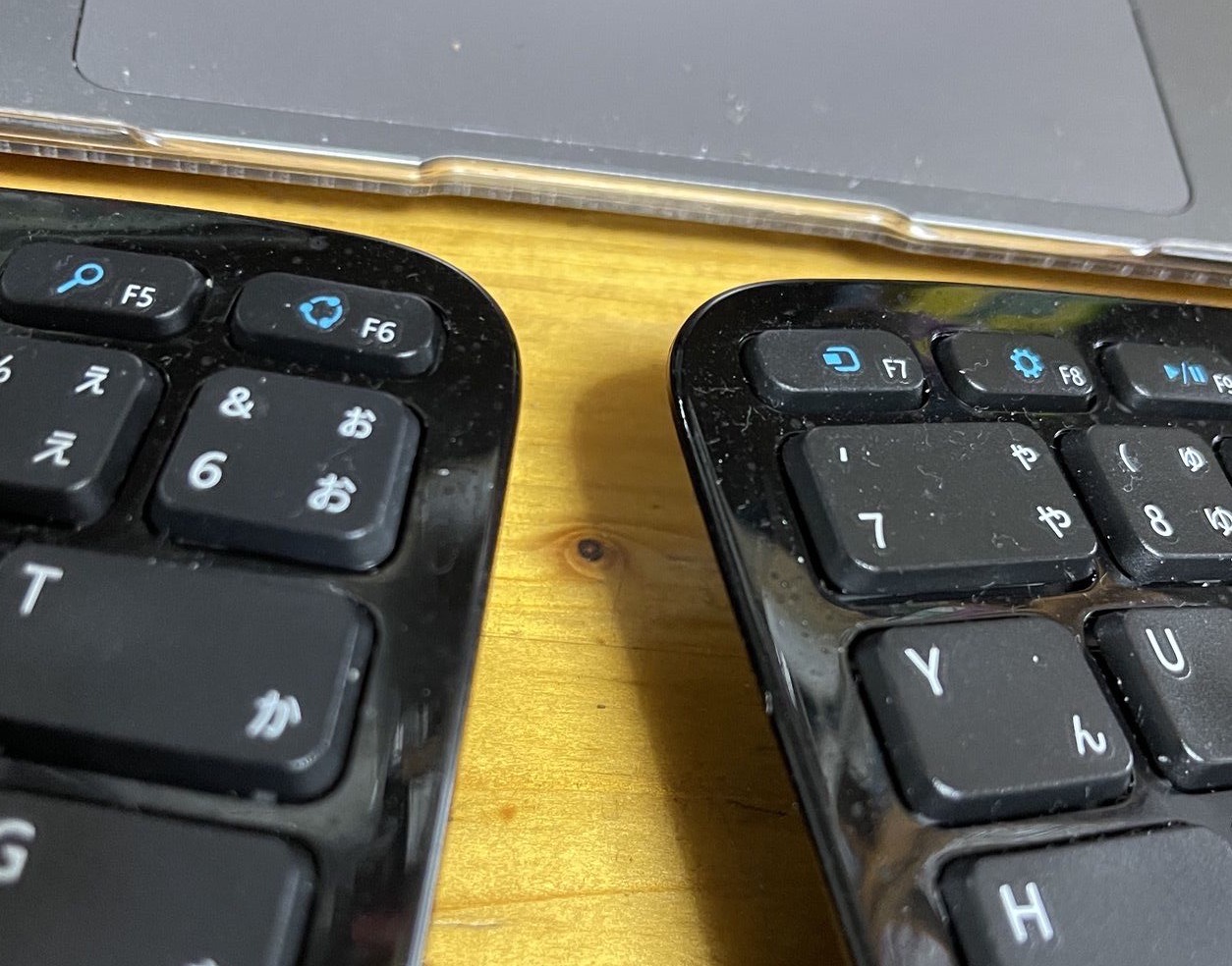 木目が目のように見えるんですが、ちょうどエルゴノミクスキーボードの隙間から覗いて「目が合う」ので怖いです、という写真です。 瞳孔まであるんですよ……。