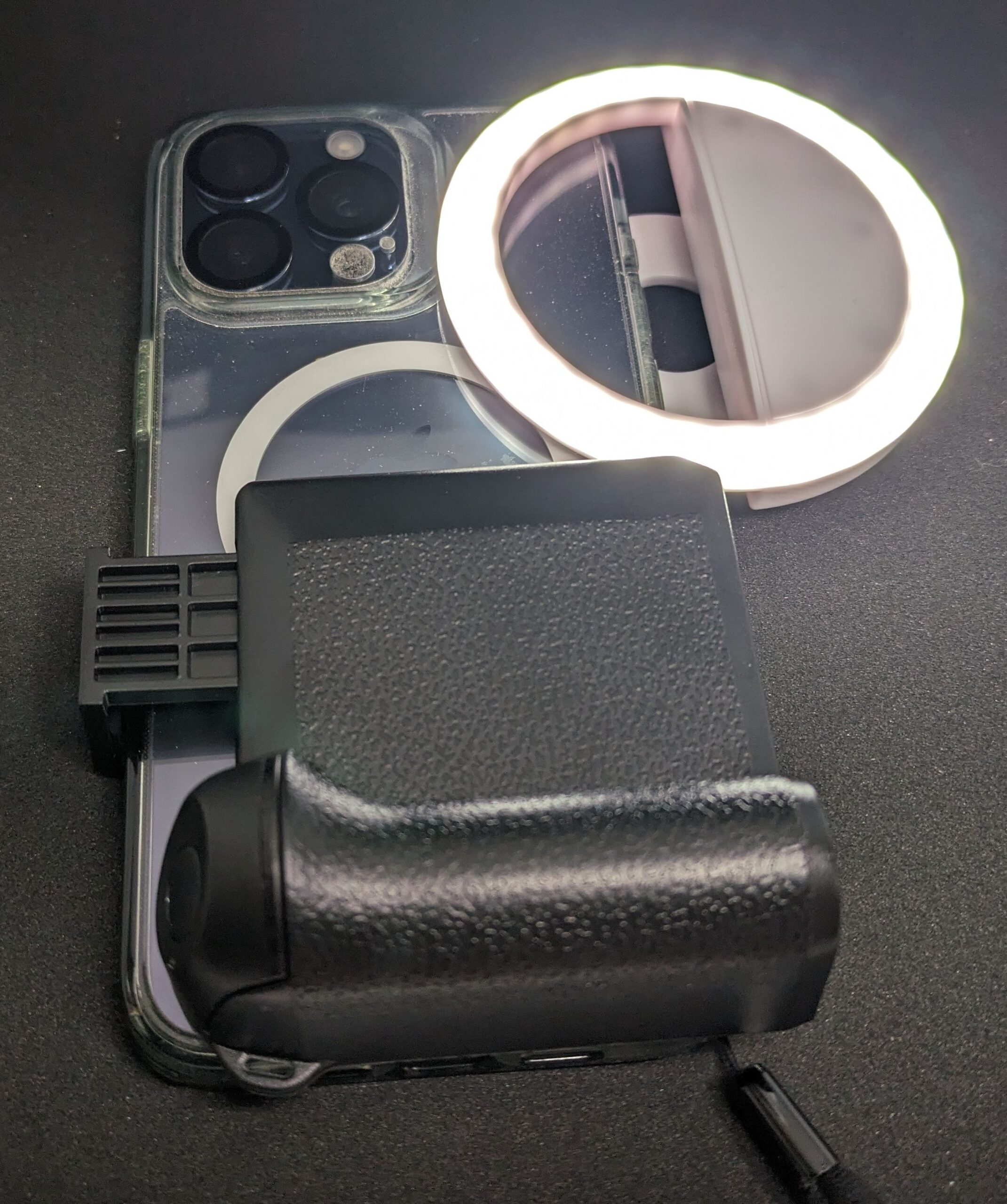 多分なんですけど、シャッターがiPhone15ProMaxに「カバーを付けた」状態を想定していないのと、LEDがカメラを囲んで配置される想定なのが、iPhone15ProMaxでは無理なので側面に取り付けてこういうキメラな見た目になってしまいます。